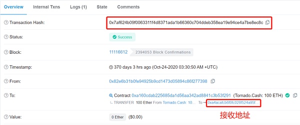接著,我們查看 Tornado.Cash:100 ETH 合約的交易記錄,找到地址 (0x34a...c6b) 在同一時間段(即 2020-10-24?3:00:07~6:28:33?(UTC))的存款記錄,下圖紅框地址 (0x82e...398) 在此時間段內大量提款的異常行為引起了我們的注意。