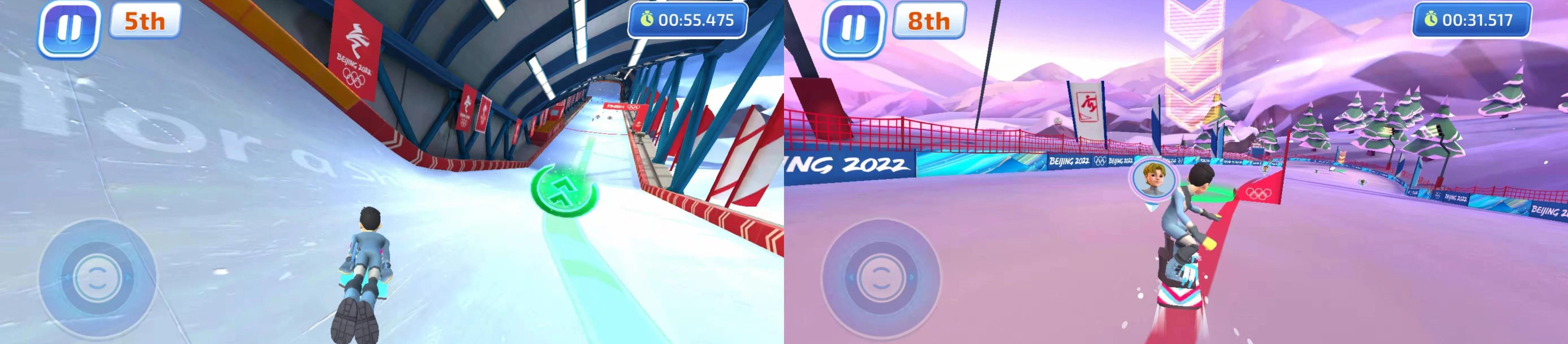 四個游戲隨機出現,因此又被稱為「大亂斗」。具體游戲玩法非常簡單,類似《跑跑卡丁車》以及《QQ飛車》,玩家需要操縱運動員進行左右移動,超越對手獲得更高名次。在游戲中,如果玩家撞到障礙物,速度就會受到影響降低,因此游戲中設置了兩種「加速器」,幫助玩家提高滑行速度,如下所示: