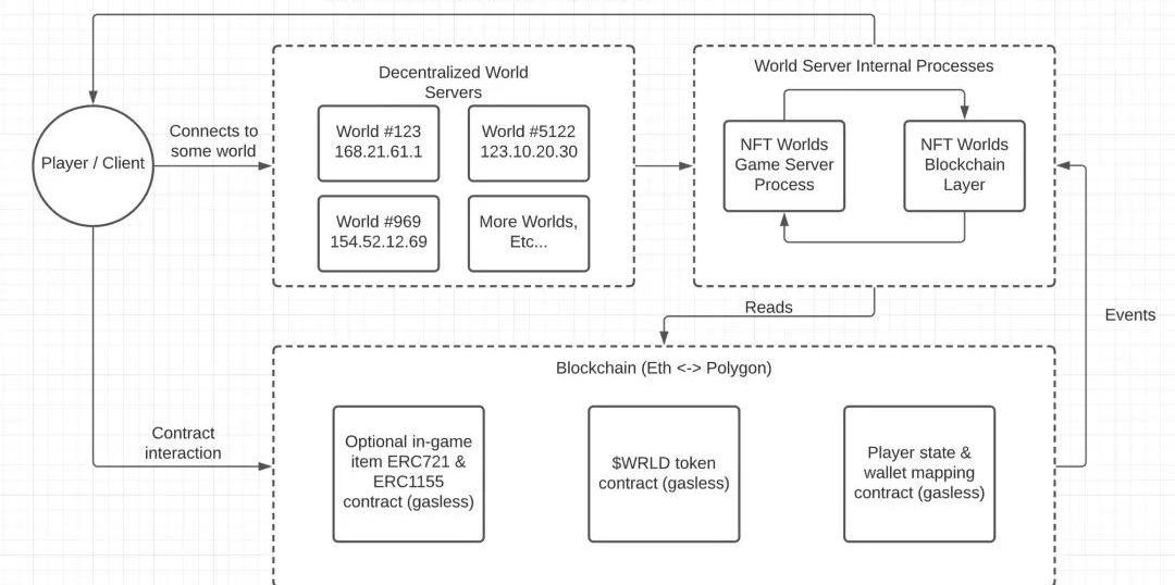 NFTWorlds的NFT世界基于以太坊鏈。為求無gasfee,其代幣$WRLD除去在以太坊上部署了以外,也部署在了Polygon上。目前,NFTWorlds已經先行推出了5個官方認證的世界,可供玩家進入玩耍。這幾個世界分別是:NFTWorldsSMP#6233NFTWorlds官方搭建的《我的世界》測試服,用于測試服務器開發、瓶頸和更新;TheMothership#9856GrayBoys母艦;DinoWorld#3523NFT項目BadBabyDino創建的恐龍世界;SkuxxVerse#3049SkuxxVerse開發的PvP多人游戲;MUSEOraia#9452MuseDAO創造的探索數字民主、文化和經濟的模擬世界MUSEOraia。底層機制