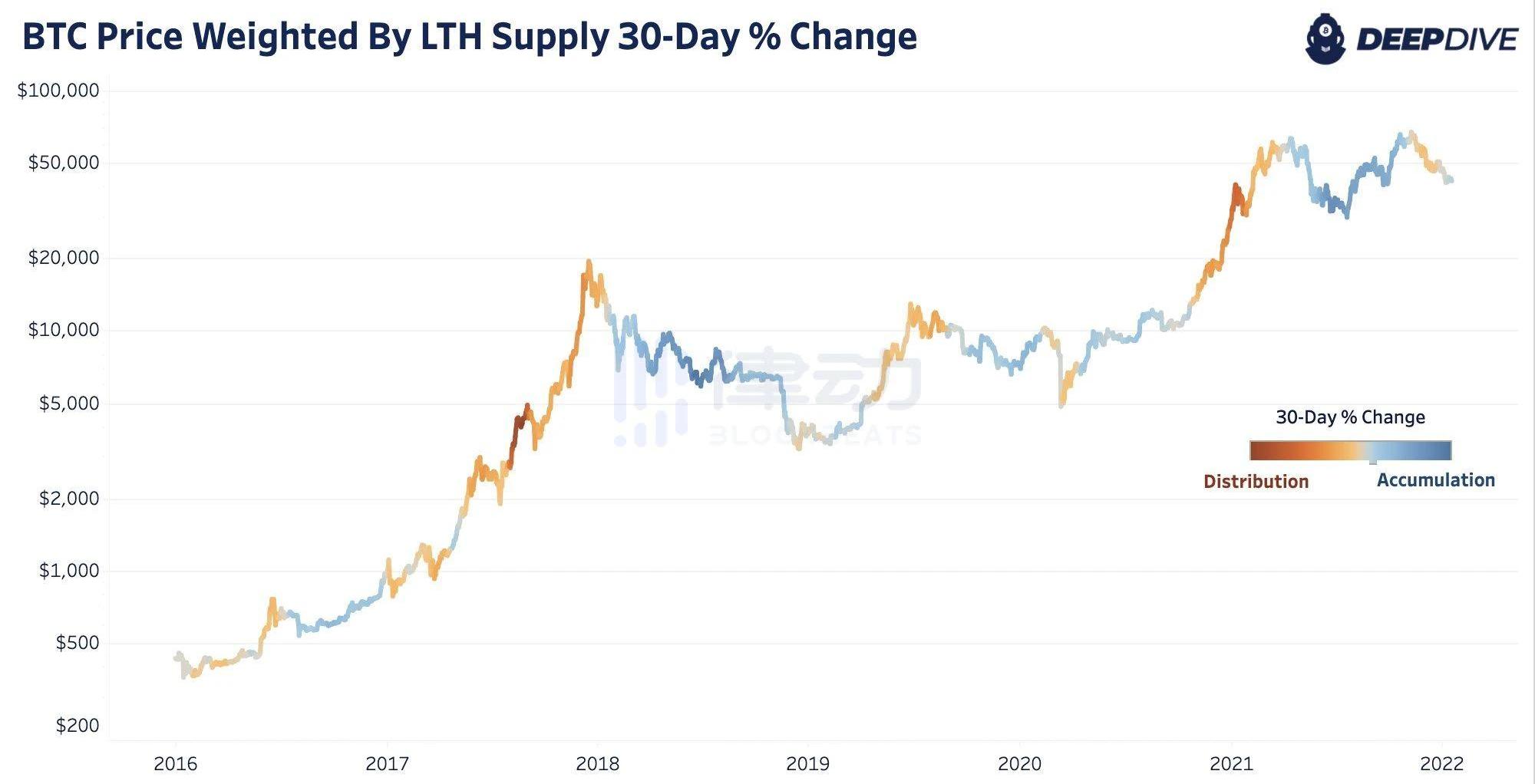 我們還看到長期持有者在過去幾個月的下跌趨勢中不斷拋售,這在比特幣歷史上是一個奇怪的現象,因為長期持有者通常會在熊市和盤整期間不斷積累,并在上漲趨勢中拋售。