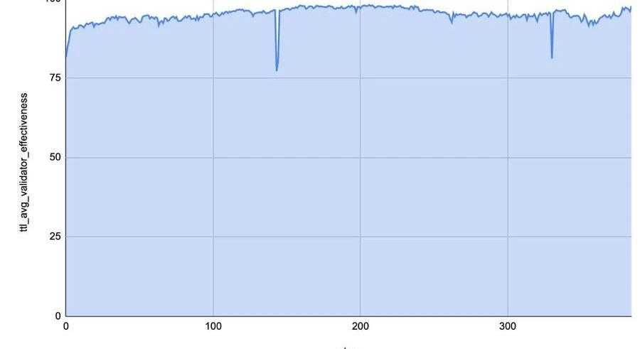 29、在網絡上,驗證者有效性一直在90%到95%之間,在網絡升級期間有幾次急劇下降。一旦驗證者面臨協調更復雜的活動,而不僅僅是證明,那么看看它的行為將是非常有趣的。