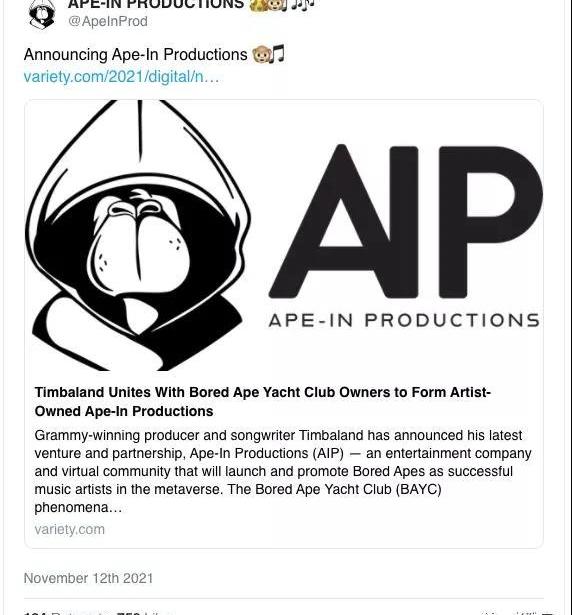 APE-INproductions是一家由藝術家擁有的娛樂公司,由格萊美獎得主Timbaland和BAYC成員共同創立。該品牌將擴大、推出和推廣BoredApes作為虛擬世界中成功的音樂藝術家,到目前為止,他們已經發布了兩首曲目。名為TheZoo的嘻哈團體是第一個與Apesh!t合作發布歌曲的NFT,之后又發布了第二首歌曲「TakeOff」。AIP制定了激動人心的合作計劃,并為Token持有者提供參與最高級別創意媒體的機會。