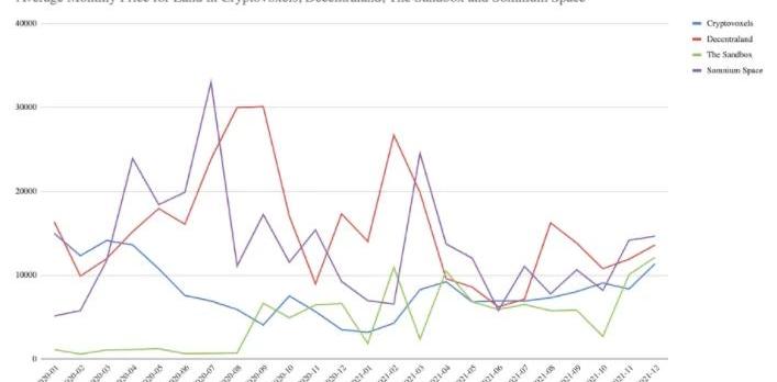 圖1:Cryptovoxels、Decentraland、TheSandbox和SomniumSpace中土地的平均每月價格土地稀缺性