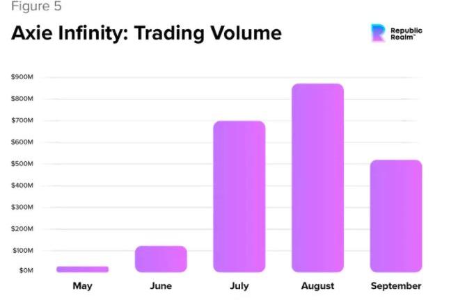 元宇宙空間中最引人注目的P2E游戲是AxieInfinity,它在2021年經歷了破紀錄的增長。在這個游戲中,玩家通過打斗精靈「Axie"獲取游戲內代幣獎勵這些代幣可以被拿到Binance和Coinbase等加密貨幣交易所交易。據報道,AxieInfinity在10月份的估值達到300億美元,主要歸功于其第三季度的表現使其成為了有史以來交易量最大的NFT系列,超過了NBATopshot和CryptoPunks。Axie在2021年第三季度的NFT銷售額為20.8億美元,幾乎占同期整個NFT交易量的20%。該平臺今年的日活躍用戶超過200萬,這一數字讓這個新興的P2E游戲獲得了更龐大的游戲行業的認可。