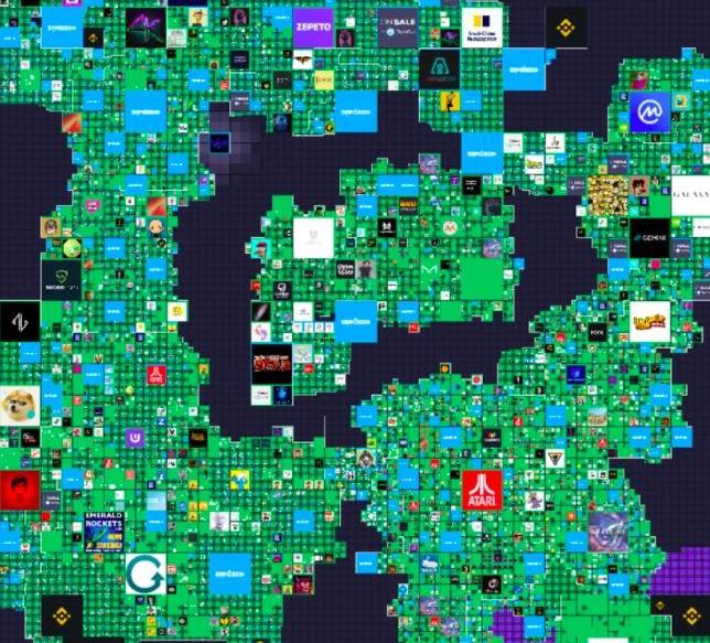 圖:TheSandbox地圖。所有者可以自由地在他們的土地上印上任何圖像,通常是logo迄今為止,TheSandbox已獲得超過165個IP合作伙伴,包括阿迪達斯、史努比狗狗、行尸走肉、愛心熊、Atari、CryptoKitties、小羊肖恩和史克威爾·艾尼克斯。每個合作伙伴都打算在他們的土地上開發內容,例如多人游戲和社交體驗,因為品牌希望在元宇宙中永久建立自身形象。與此同時,BoredApeYachtClub、CyberKongz、PartyDegenerates和SolanaMonkeyBusiness等NFT項目已經在TheSandbox購買了土地,每個項目都打算開發自己的地產用于社區空間、游戲和活動。Cryptovoxels