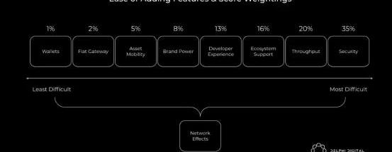 吞吐量由于可以量化,所以結果很直觀。ImmutableX的TPS能達到9000,Polygon7200TPS,WAX4000TPS,Flow100TPS,Ethereum15TPS。接下來,我們來評估安全性。ImmutableX所處的Starkware-builtL2可以提供接近以太坊的安全性,但是也會有所不同,這就是為什么它排名第二。鑒于其無權限的約100個驗證節點,Polygon位居第三。Flow排在第四位,盡管目前是高度集中的。正如我們之前提到的,隨著時間的推移,Flow可能會變得更加分散,我們認為,與WAX所依賴的21個驗證節點的EOS相比,DapperLabs團隊可信度更高。**錢包:**盡管增加對錢包的兼容性相對容易,但仍對用戶體驗有重要的直接影響。Polygon在這里排名第二,因為它目前支持大多數錢包,盡管用戶需要做一些額外的配置。ImmutableX可以支持任何以太坊錢包,且用戶的負擔最小,但由于目前只有MetaMask可用,我們不得不暫時將其排名第三。我們決定將WAX排在Flow之前,因為他們已經建立了一個非常直觀的云錢包,而Flow似乎仍然只提供托管解決方案。**法幣業務:**鑒于大多數人還沒有用加密貨幣進行交易,能否使用法幣可能是主流平臺的首要任務。可以直接使用信用卡支付是NBATopShot成功的一個主要因素,也是Flow排名第二的原因。然而,由于扣款,信用卡支付可能對用戶體驗產生負面影響。Polygon在法幣業務方面排名第三,因為它和以太坊上的流動性互通。考慮到其云錢包的功能,WAX位列第四。我們不得不將ImmutableX在這個類別中暫時排在最后,因為它目前缺乏法幣相關業務,但這很快就會改變。**開發者體驗:**我們根據構建東西的容易程度來評估開發者體驗。許多事情都會影響到這一點,如詳細的文件、可用的Github倉庫、所使用的編程語言、現有的工具等。以太坊居于首位,鑒于強大的EVM兼容性,Polygon緊隨其后。根據我們采訪的開發者,之后的排名順序應該是Flow、WAX和ImmutableX。值得注意的是,CAIRO是一種非常新的語言,隨著時間的推移,它的應用應該會越來越廣。生態系統兼容性是指每條鏈利用現有構建模塊的難易程度,以及該生態系統的廣泛集成程度。Polygon的EVM兼容性使其成為第二名中。緊接著是ImmutableX。如前所述,雖然它不像Polygon那樣兼容EVM,但ImmutableX仍然能夠從現有的以太坊生態系統中獲益。EOS雖然與以太坊的生態系統相差甚遠,但仍有其好處,WAX可以從中受益。Flow還沒有相同類型的開放生態系統或外部市場支持,所以排在最后。**NFT“品牌效應”:**我們認為,現有的品牌力量是吸引新IP到一個特定平臺的重要因素。因此,鑒于NBATopShot的巨大成功和他們賽道中的其他IP,Flow是第二名,排在Ethereum之后。ImmutableX緊隨其后,它已經吸引了幾個強大的游戲品牌。接下來是Polygon,因為它已經能夠吸引幾個DeFi藍籌股和Aavegotchi等NFT項目。最后是WAX,除了最近的ToppsMLBNFTs,它未能吸引任何有影響力的品牌力量。WAX歷史交易量較低,這反映了它主要托管廉價和質量較差的產品,這直接導致它們吸引了較少的資本和市場。**資產流動性:**最后,我們將資產流動性定義為NFT可以從一條鏈轉移到另一條鏈的容易程度。從技術上講,ImmutableX可以在不犧牲安全性的情況下,提高以太坊上NFT的流動性。其次是Polygon,它的PoS鏈的NFT提取可能需要30分鐘。我們把WAX排在第四位,因為他們正在積極建設一個通往以太坊的橋梁,這已經在他們的路線圖上有一段時間了。Flow的雙向橋計劃仍不清楚,所以排在最后。**PS:**這些評分因素之間并不都具有可比性,并非所有的因素都同樣重要,有些因素改進起來要更難。例如,對于一個解決方案來說,增加他們支持的錢包比突然提供更好的安全性和更大的吞吐量要容易得多。后者可能需要對設計架構進行徹底的修改和重建。考慮到這一點,我們開始對這些因素本身進行排名,以便我們可以使用權重來調整之前的分數。最終得到一個更加準確的評分表,如下所示。