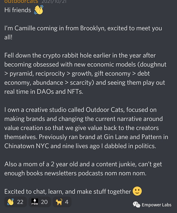 但它又是一個有著如此復雜特質的社區,在頻道里逛幾天根本不足以理解這個社區。為了了解FWB到底是什么,我翻閱頻道里的大量歷史信息,閱讀了所有的提案及相關詳細文檔,聽了大約10小時的podcast采訪和各類媒體文章,最終才勉強拼湊出了FWB的模樣和特質。