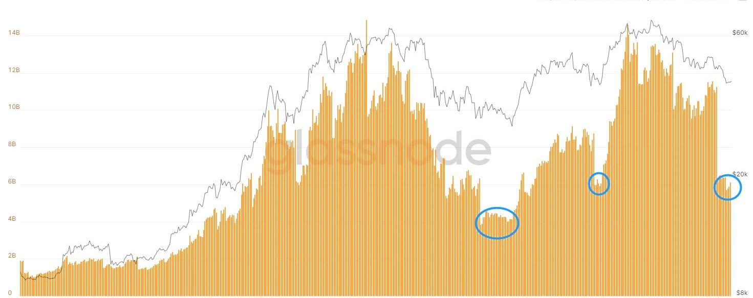 IlliquidSupplyChange:從大周期看,比特幣:非流動性供應量變化(Bitcoin:IlliquidSupplyChange)由凈增加變為凈減少往往意味著牛熊轉換,2017牛市和2021牛市均如此。并且在牛市期間,非流動性供應量以凈增加為主;熊市期間,非流動性供應量以凈減少為主。目前非流動性供應量還在凈增加,該數據表明上漲行情仍在。