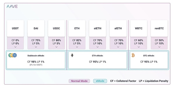 如果用戶在 eMode 中自行選擇使用 Aave 協議,當該用戶提供與用戶抵押品相同類別的資產時,借貸能力(LTV)和維持保證金(清算閾值)將被 eMode 類別配置覆蓋以允許更高的資本效率。