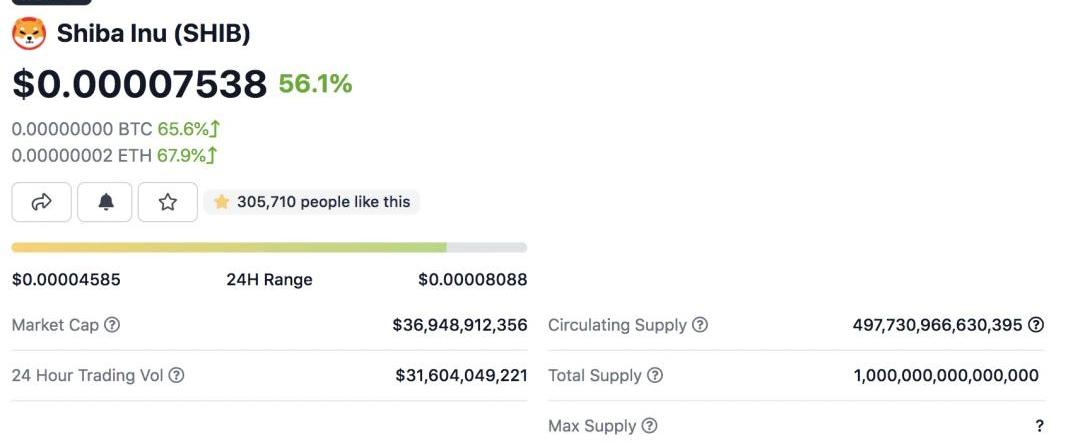 CoinGecko平臺數據顯示,SHIB市值已超過了股票和加密交易平臺Robinhood,達到369億美元,而Robinhood(HOOD)市值為300億美元,歐洲銀行業巨頭法國興業銀行和德意志銀行市值分別為280億美元、260億美元。SHIB在CoinGecko上成為第九大加密貨幣,超過了主要競爭對手狗狗幣,年初至今漲幅近40倍。