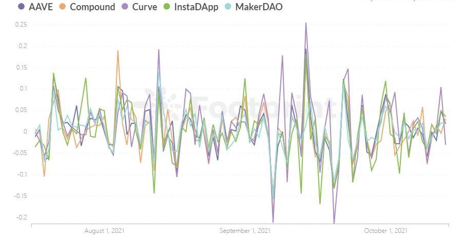 前10大TVL平臺各項指標對比,數據來源:FootprintAnalytics1.總鎖倉量對參與DeFi投資的人來說,TVL這個指標并不陌生,可在各大數據平臺上獲取所需的DeFi平臺TVL數據。TVL指用戶存入并鎖定在協議中的資產總額,該值越大代表著該項目集聚的資產越多,用戶對該項目的信任度高,更愿意將資產存入該平臺進行各類經濟活動,匯聚的用戶量也越多,受歡迎的程度越高。從上圖看,TVL排名前十的平臺,除了體量大外,TVL月度基本保持增長趨勢,這證明項目在持續保持其活力和實力。2.市值市值反映一個項目在DeFi行業的市場價值,該指標與傳統股票市場的計算方式類似,主要受幣價與已流通可供交易的代幣數量影響。如上圖所示,由于代幣數量受流通量以及供需影響,幣價是隨時變化從而影響市值變化,但市值漲幅或者跌幅保持在20%左右的合理區間,并無出現暴漲再懸崖式暴跌的情況。對基礎指標了解后,讓我們看如何利用基礎指標進行項目評估,發掘有潛力、值得投資的項目。TVL排位不宜太后,在排名位列于中段及以上項目挑選對象