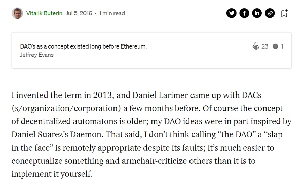 關于DAO的概念,最初Dan Larimer(EOS的前CTO)于2013年提出了去中心化自治公司(DAC,Decentralized Autonomous Corporation)這一術語,但DAO的概念是被Vitalik Buterin汲取了Dan Larimer的概念后并將其歸納,創造了去中心化自治組織(DAO,Decentralized Autonomous Organization)一詞。但是據V神說,這一概念部分受啟發于Daniel Suarez的小說《守護程序(Daemon)》。