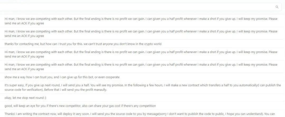 最后,對于像我們這樣在線忙碌人士來說,最有趣的IDM是鏈上對話。兩個MEV機器人操作員之間的“暖心”交流是卓有成效地使用兩方IDM的最好例子。