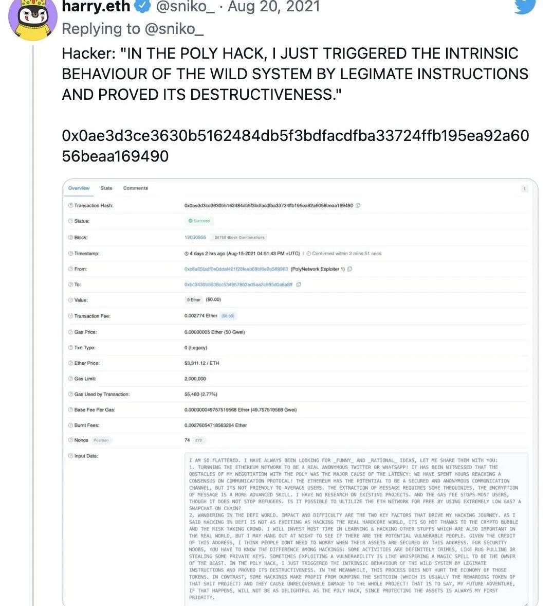 8月11日,我們看到了有史以來最大的一次加密貨幣黑客攻擊。PolyNetwork的6.11億美元被盜。被黑客攻擊的數量巨大,并不是此次黑客攻擊的唯一特點。與大多數黑客攻擊不同的是,這個攻擊有一個持續的敘述伴隨著它,由發送到黑客地址和從黑客地址發送的消息提供。它甚至有一個自行發布的問答系列!