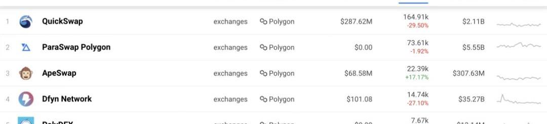 在過去30天內,Polygon上排名前三的DeFi協議與其智能合約交互的獨特活躍錢包的數量都有所增加。有趣的是,這些dapp也在以太坊上,但今年在Polygon上推出了dapps。