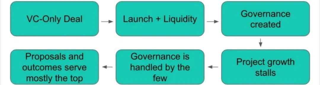 寡頭和貴族的治理形式似乎是原始政府最常見的自然形式之一。平民應該將他們的聲音轉移給精英和知識淵博的人的想法在任何社會中都是一個有吸引力的想法,但很少會為大多數人帶來更好的結果。DeFi也不例外。與任何新領域一樣,早期的DeFi大部分都是由希望支持新形式金融技術的風險投資家發起的。但伴隨著DeFi的成長和發展,出現了一些關于協議真正去中心化的結構性問題,主要是因為它們無法進行連貫的治理,最終不會像卡特爾一樣運作。在DeFi中,治理通常以投票方式進行,提案必須達到一定的投票門檻才能通過。這些投票通常由代幣所有權分配。一個實體持有的代幣越多,它擁有的選票就越多,從而有更強的影響力。在紙面上,這似乎是標準的民主。但這個簡單的機制包含了DeFi治理萎靡不振的種子。代幣和開發流程如下: