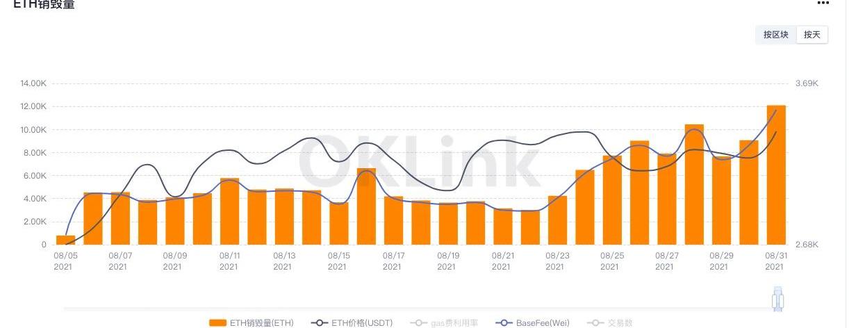 OKEx歐易行情顯示,ETH價格昨日從3188美元一度上漲達到3473美元,最高漲幅接近9%。即便今天BTC開始下行,ETH也并未跟跌,依然保持強勢橫盤;截至發稿前,ETH價格維持在3400美元以上,正在3450美元附近徘徊。ETH昨日的強勢表現,很大程度上與其銷毀量以及流通量有關。Etherscan數據顯示,昨天ETH全網共計生成6443個區塊,按照每個區塊2個ETH獎勵計算,昨日全網新增ETH數量即為12886個。由于近期的NFT熱潮帶動BaseFee上漲,近期ETH銷毀量持續上升。Oklink數據顯示,昨日EIP-1559銷毀量首次超過1.2萬個,達到12104個,創下歷史新高;銷毀的ETH數量,基本抵消了ETH新增數量。可以想見,隨著NFT熱度的持續攀升,ETH將在未來幾天實現了真正意義上的「通縮」。