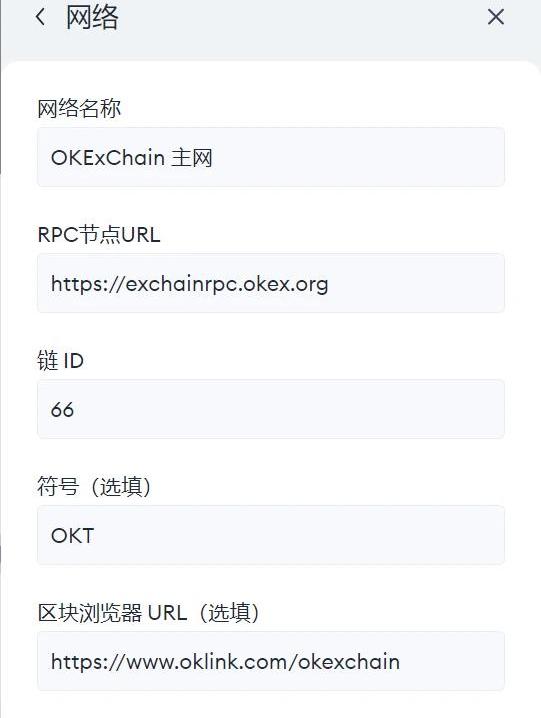 在彈出的表單中輸入下列信息:網絡名稱:OECMainnet新增RPCURL:https://exchainrpc.okex.org鏈ID:66符號:OKT區塊鏈瀏覽器URL:https://www.oklink.com/OEC/