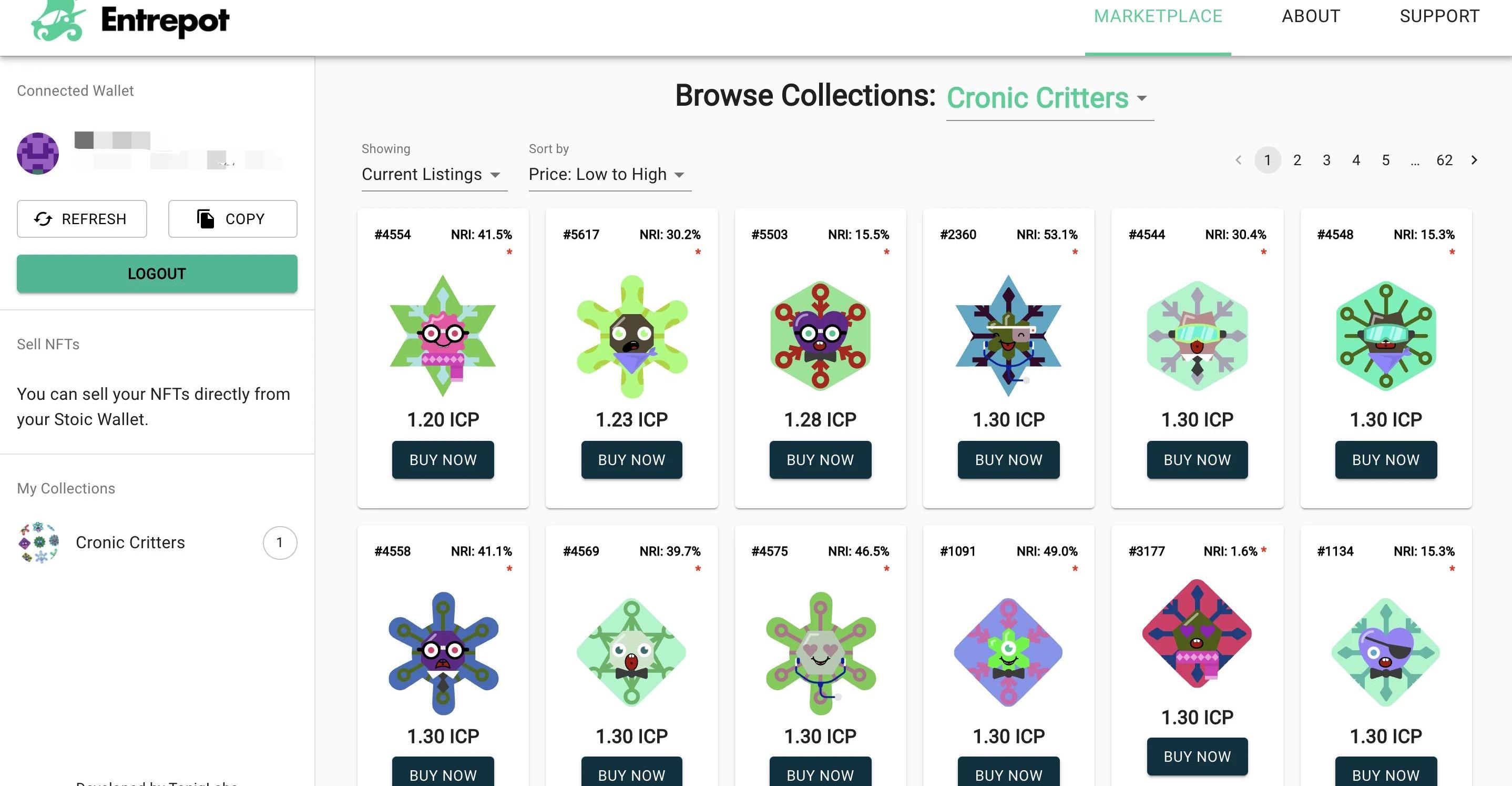鏈接:https://entrepot.app/介紹:ToniqLabs出品,使用上面的Stoic網頁錢包就可以登陸,是DFINITY上最早推出的NFT平臺,使用ICP交易NFT,目前上線不到兩周已經產生了35萬美金的交易額。