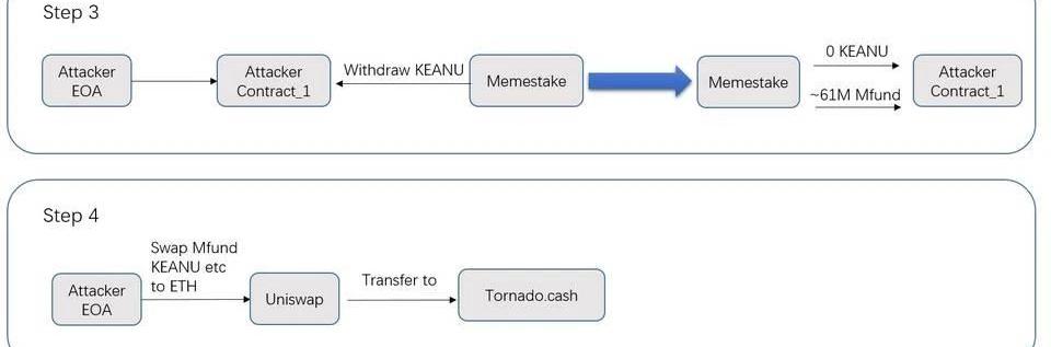 前面介紹了漏洞成因及漏洞的利用方式,我們接下來介紹攻擊者實際是如何進行攻擊的。如圖所示,攻擊可以分為4步,其中關鍵攻擊步驟為第2步,利用通縮代幣的特性操縱Memestake的獎勵計算。