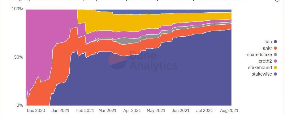 來源https://duneanalytics.com/LidoAnalitycal/Lido-Finance-Extended●Sushiswap為LDO-ETH提供了溫泉計劃●1inch:Lido上線后不久,stETH就被1inch所集成●DeversiFi:LDO3月份正式上線L2交易所DeversiFi●Bancor:在7月13日wstETH上線Bancor的wstETH-BNT礦池,用戶可以在Bancor的無常損失機制的保護下進行stETH的收益獲取●Uniswap:由于Uniswap建池完全無許可,所以在UniswapV2上很早就有了stETH的流動性,考慮到Curve對stETH/ETH場景的契合,團隊并沒有對Uniswap的流動性做激勵,所以目前在Uniswap的v2流動性很少;在UniswapV3上線之后,Lido的樂高小隊也發起了在UniswapV3進行測試的提案借貸:●3月Lido與ARCx集成,允許stETH作為抵押品來鑄造STABLEx代幣--ARCx平臺原生的穩定幣。●InverseFinance在6月21日支持將stETH作為抵押品。●Aave--未上線:ParaFiCapital的Anjan在Aave治理論壇提出提案,提議將stETH作為抵押品,目前社區正在進行討論。●Maker--未上線:目前社區正在進行討論●Compound--未上線:ParaFiCapital已經在在Compound治理論壇提出提案,提議將stETH作為抵押品。其他:●保險:Lido與保險協議Unslashed合作,對20余萬枚stETH進行了投保;也與Nexus進行了合作●收益協議:Yearn、Harvest和Convex都上線了crvSTETH的收益池●入口集成:Lido被集成進了GnosisSafe,GnosisSafe是深受信任的多簽錢包,目前已經有超過200萬個ETH存儲在GnosisSafe。另外,Zapper、Zerion等聚合平臺以及ArgentWallet、TrustWallet、Imtoken等錢包也集成了LidostETH在DeFi里的充分應用,使得用戶在維護ETH2.0穩定的同時,用戶質押了的ETH(其實是stETH)仍然能夠在各個DeFi應用內使用,這使得Lido真正的提供了“流動性質押解決方案”:用戶可以幾乎不損失流動性的參與質押。由于stETH的流動性護城河和與之相關的網絡效應,stETH在ETH質押衍生品將非常可能會“贏家通吃”。因此,stETH有可能在許多用例中取代ETH,甚至有可能完全取代ETH。目前來看,stETH只需要被Maker、Aave和Compound這三個最主要的借貸產品整合,就和ETH沒有很大的區別了。我們預計,這一進程最晚在信標鏈的轉賬功能開啟時發生,而能否提前發生,主要取決于市場對ETH2.0的信心、參與程度以及Lido的持續努力。以stETH為代表的的ETHStaking衍生品將對整個以太坊生態系統產生重大影響,包括ETH質押者、普通ETH持有者、甚至以太坊本身。質押者:質押者的主要好處是可以進行再抵押,這允許他們在獲得質押收益的同時存入借貸協議或dex做LP獲取其他的收益。這大大降低了Staking的機會成本。非質押ETH持有者:如果stETH可以作為抵押品借入ETH,則可以解鎖借入ETH用于杠桿質押的需求。這將推高供應ETH的利率,最終使所有利率更高的ETH持有者受益。以太坊:stETH這類衍生品對于以太坊的影響,Paradigm的Georgios和Hasu的論證(https://research.paradigm.xyz/staking)很精彩,我們摘錄如下——“存在一種流行的觀點,即質押衍生品會降低PoS的安全性,因為它們將區塊生產與質押和懲罰分開。這也被稱為委托代理問題,并且可能導致區塊生產者沒有遵守協議的動機,因為與他們沒有任何利害關系。然而,這個論點必須權衡收益:如果抵押衍生品降低了抵押成本,它們可能會導致更多ETH被抵押。請注意,這是一個良性循環的完美例子:stETH的流動性越強,參與質押的機會成本越低,從而導致更多的ETH被抵押,進而進一步加深stETH的流動性,依此類推。如果沒有抵押衍生品,我們可能預計15-30%的ETH將被抵押。然而,當有了質押衍生品之后,這個數字可能高達80-100%,因為與不參與質押相比,質押沒有額外的成本。為了說明為什么這會帶來更高的經濟安全性,我們來看以下攻擊場景——●如果所有ETH的20%被抵押,而攻擊者想要獲得所有代幣的66%,他們將不得不在公開市場上購買所有ETH的40%。●如果60%的ETH被質押,但stETH是流動的,那么攻擊者將不得不購買所有stETH的66%,也就同樣是所有ETH的40%。請注意,這有額外的步驟,攻擊者首先必須贖回stETH以去除誠實的驗證者,然后重新抵押他們的ETH。●超過60%的ETH被質押,攻擊者必須購買的所有ETH的份額就高于40%,并且從此開始,攻擊者需要購買的ETH數量就只會更多。●如果100%的ETH被質押,那么攻擊者需要所有stETH的66%才能達到相同的閾值。我們可以得出結論,如果抵押衍生品可以將抵押的ETH數量增加到60%以上,那么它們將嚴格提高以太坊的經濟安全性,而不是降低它。”另外我們可以發現的是,相當多的集成都是由Lido的投資人促成的。包括ParaFi、Delphi都在積極促成Lido與各個DeFi項目的合作,而Paradigm更是在引導著Lido的發展,這是Lido發展過程中一個很重要的特點,同時也是一個很重要的優勢:Lido得到了以太坊核心開發者、社區和代表以太坊正統基金的全力支持。去中心化問題