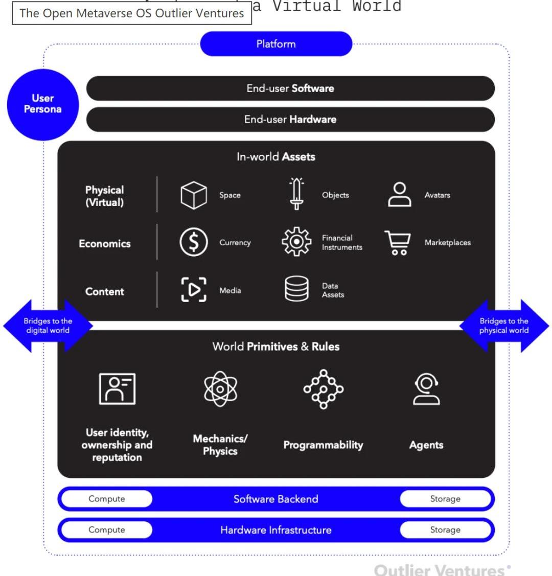 像《頭號玩家》這樣的科幻作品,將"Metaverse"既描述為一個終點,也描述為一個捕捉和控制的反常過程。在《頭號玩家中》:IOI,一個巨頭公司,想要擁有和控制OASIS的服務器和數據庫,在那里他們可以刪除賬號,訪問任何信息,改變世界的規則,并為自己印制無限的貨幣。我們今天在游戲中體驗到的第一個虛擬世界與網絡的相似之處是驚人的:集中化、封閉、專有和采掘,股東至上而非用戶優先。被迫給出你的時間和數據以換取對平臺的"免費"訪問已成為正常現象。隨著我們在平臺上投入更多的時間、數據和財富,我們認為審視他們的設計原則、商業模式和服務條款至關重要,這樣我們才能決定我們是否希望繼續選擇加入或剝離到其他方案中。經過OutlierVentures幾個月的發展,加上我們不斷增長的相關創業公司和合作伙伴網絡,我們已經創建了一個框架來評估和審視Metaverses,以及一個工具包來設計基于用戶中心和身份、數據和財富主權原則的替代品。我們稱之為"開放的Metaverse操作系統",這是一種共享和開放的操作系統,建立在去中心化協議的成功之上,特別是基于區塊鏈和加密資產的Web3Stack中出現的DeFi和NFT。定義Metaverse