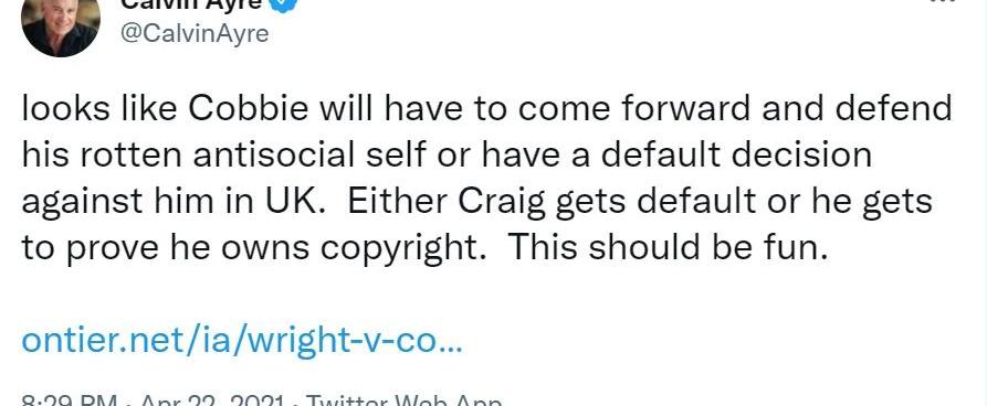 反對控制白皮書行為的聲音此后CSW于2月24日向Cobra和網站的許多貢獻者提起版權侵權訴訟。在反復的訴訟中,6月28日案件終于開庭。出于對自身匿名身份的保護,Cobra缺席了聽證會,CSW輕松獲勝。Bitcoin.org將不得不從其網站上刪除白皮書,此外還必須支付3.5萬英鎊的法律費用。
