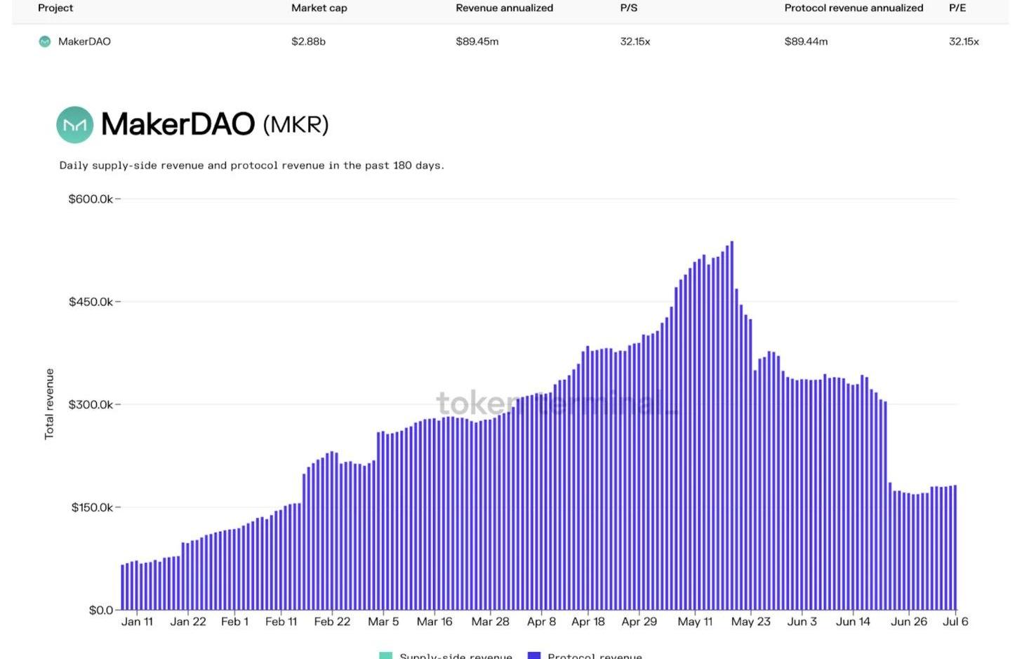 結合具體數字可見,此類項目中,Polygon之上的頭部DEXQuickswap在P/S和P/E數字上均名列榜首,緊隨其后的是依然是幾大DEX,包括BSC龍頭Pancakeswap以及老牌項目Sushiswap。相較于DEX,Compound、Aave等借貸協議在P/S上尚有一戰之力,但在P/E上卻存在著明顯的差距。第三類項目稍微有些特殊,這些項目既有「年度總收入」,也有「歸屬于協議本身的年度收入」,但二者完全一樣,即P/S和P/E數字相等。此類項目的典型代表就是MakerDAO,所有的利息收入都將流向協議本身,之后再以回購形式將價值返還給所有MKR持幣者,所以從圖中可見其P/S和P/E數字都是32.15x。