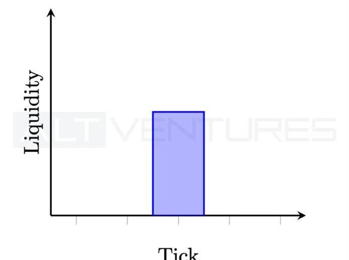 Table4流動性聚集方式UniswapV3允許每個LP設置任意的流動性范圍,以期望總體流動性聚集在一個最活躍的區間。但是,理論上,根據每個LP的自主決定,流動性可以被塑造成任意分布。舉例來說,一個和UniswapV2等效的流動性分布入下圖所示: