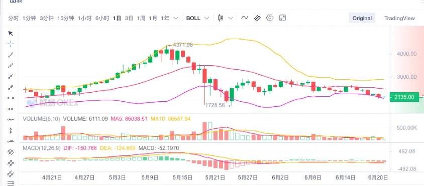 1.現貨市場OKEx行情數據顯示,上周ETH價格震蕩下行,周內收于2111美元,環比下跌18%。