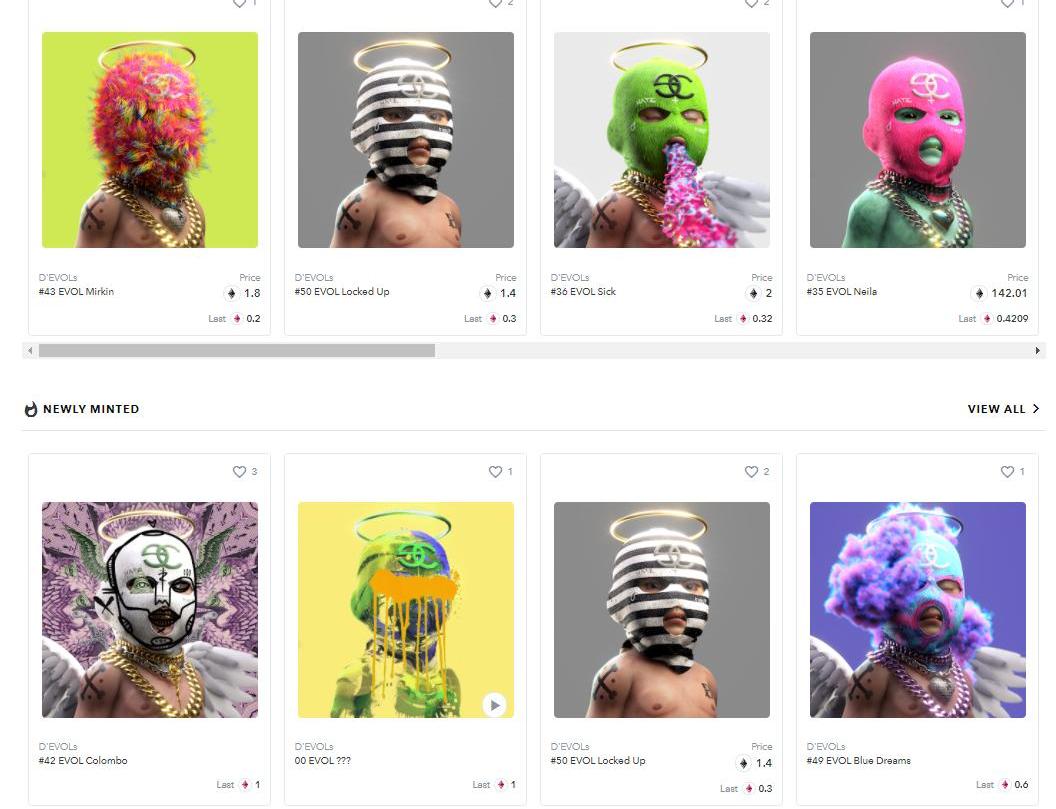 NiftyScannerAnalysis分析結果:1、媒體及元數據是存儲在IPFS網絡上的2、智能合約在Etherscan區塊瀏覽器上經驗證D’EVOLs最近有了驚人的突破,進入了OpenSea市場上的前30名項目榜單。這個項目原本是個傳統的藝術形式表達,后來其創造者決定探索NFT領域和對其藝術品進行代幣化。D’EVOLs是被其創造者的hip-hop背景所啟發的,他與美國Rap世界的一些名人有過合作:SnoopDogg,Future,GucciMane等。這個項目有堅實的技術基礎,媒體和元數據都存儲在IPFS網絡上。在NiftyScanner分析工具上,D’EVOLs的信任分數是80%。目前這個項目有51個物件和32個持有者,NFT的均價是0.51個ETH。星際視界筆者通過OpenSea市場上了解到部分收藏品的信息,以下為部分截圖。