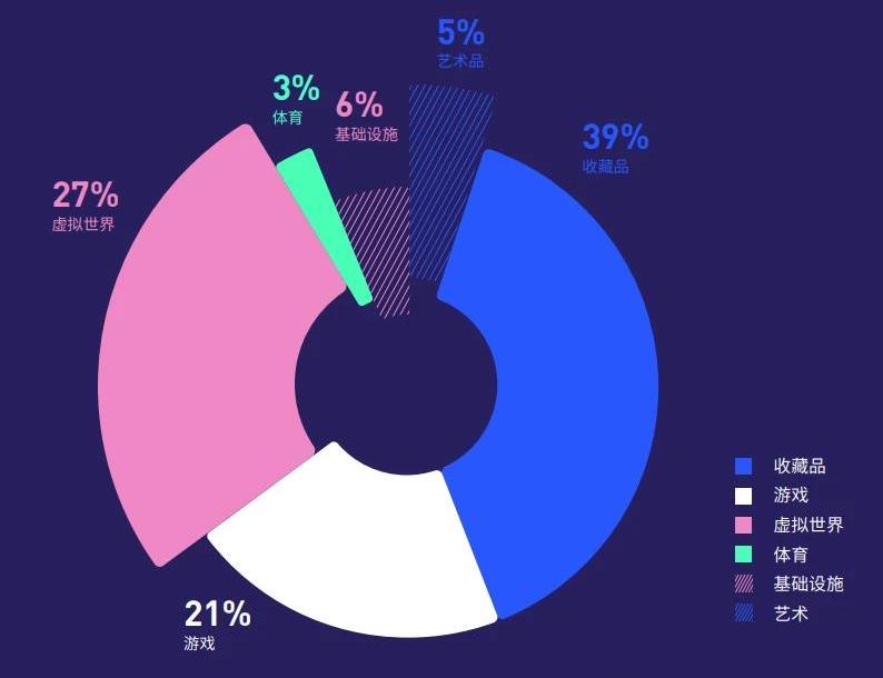 相比之下,2020年收藏品類、虛擬世界、游戲占據較大比例市場份額,分別為39%、21%、27%。