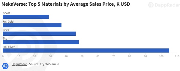 在評估 Meka 價格方面,材料是另一個具有相當分量的重要屬性。MekaVerse 系列中最稀有的一些特征,所采用的材料主要包括 Full Gold (0.07%)、Full Silver (0.12%) 和 Sky (0.18%) 。毫無疑問,包含這些材料的作品的平均銷售額最高,使用“Sky”材料的 MekaVerse 地板價可以達到 18 ETH,而使用 Full Gold 和 Full Silver 材料的 MekaVerse 地板價分別為 50 ETH 和 60 ETH。