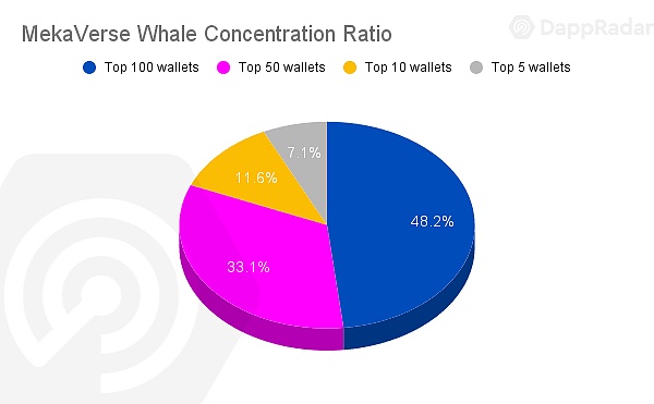 接下來,讓我們分析下 MekaVerse 是否存在“巨鯨壟斷”問題,據說顯示前 5 名 MekaVerse 持有者錢包中僅擁有 182 個 Meka,“巨鯨濃度指數”僅為 2.04%,這意味著該項目去中心化程度很高,不過鑒于 MekaVerse 是一個新晉推出的 NFT 系列,目前這種情況也比較常見。