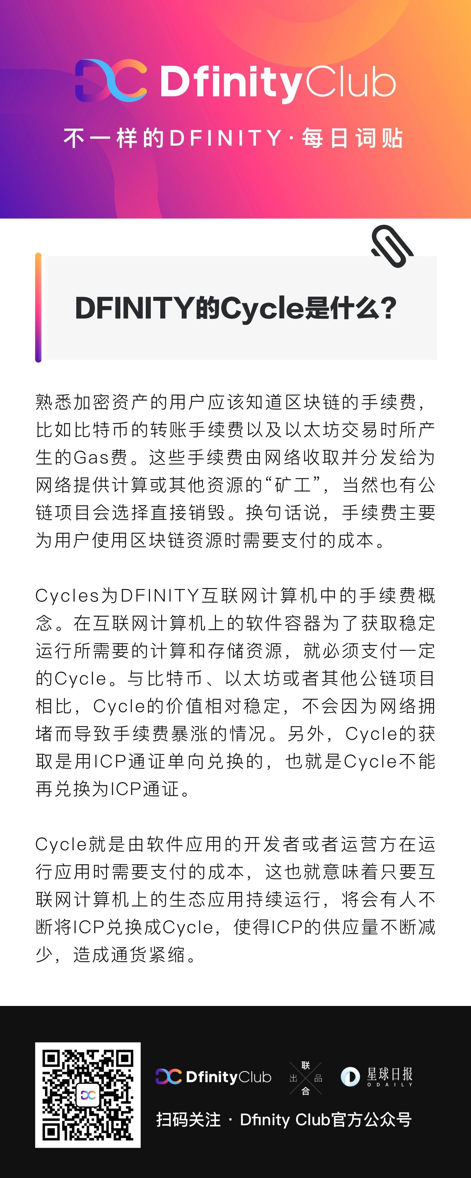 XRP/HKD-2.14%熟悉加密資產的用戶應該知道區塊鏈的手續費,比如比特幣的轉賬手續費以及以太坊交易時所產生的Gas費。這些手續費由網絡收取并分發給為網絡提供計算或其他資源的“礦工”,當然也有公鏈項目會選擇直接銷毀。換句話說,手續費主要為用戶使用區塊鏈資源時需要支付的成本。Cycles為DFINITY互聯網計算機中的手續費概念。在互聯網計算機上的軟件容器為了獲取穩定運行所需要的計算和存儲資源,就必須支付一定的Cycle。與比特幣、以太坊或者其他公鏈項目相比,Cycle的價值相對穩定,不會因為網絡擁堵而導致手續費暴漲的情況。另外,Cycle的獲取是用ICP通證單向兌換的,也就是Cycle不能再兌換為ICP通證。Cycle就是由軟件應用的開發者或者運營方在運行應用時需要支付的成本,這也就意味著只要互聯網計算機上的生態應用持續運行,將會有人不斷將ICP兌換成Cycle,使得ICP的供應量不斷減少,造成通貨緊縮。