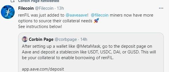 據最新消息renFIL可在Aave中使用,這無異于為各位礦工提供了更多的選擇,滿足抵押需求。