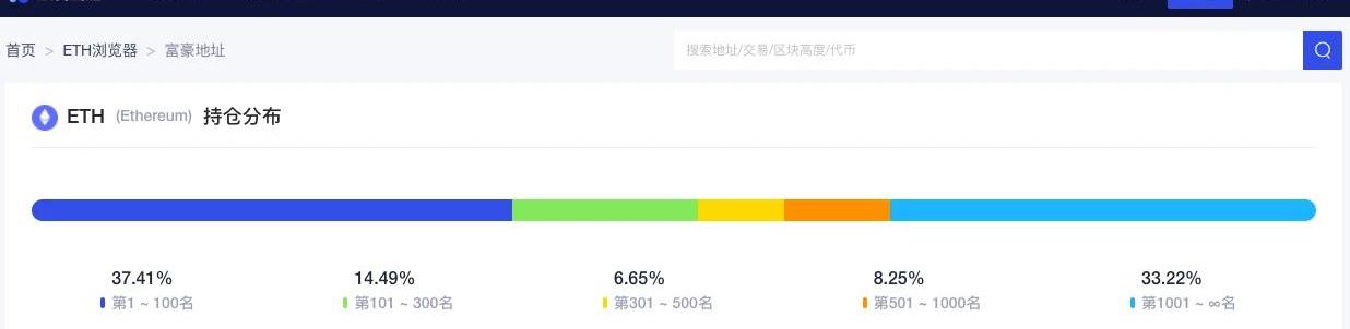 歐科云鏈OKlink數據顯示,目前ETH持倉前300名,掌握了總計51.9%的ETH,環比上漲0.11%;整個持倉分布呈現橢圓形結構,各個部分占比分別是:第1~100名,占比37.41%,環比上漲0.33%;第101~300名,占比14.49%,環比下降0.22%;第301~500名占比6.65%,環比下降0.01%;第501~1000名,占比8.25%,環比下降0.09%;第1001名后,占比33.22%,環比下降0.02%。三、生態與技術