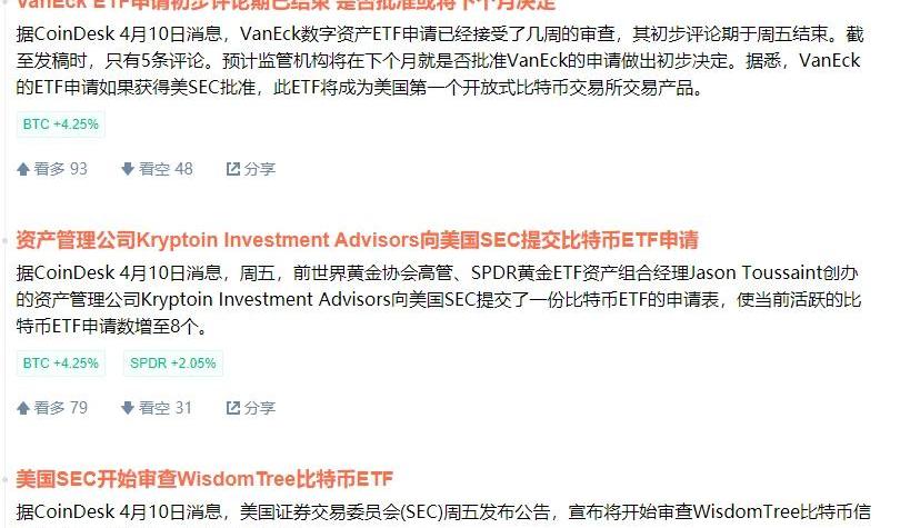Coinbase上市和美國的比特幣ETF應該是上半年加密貨幣市場最重要的兩個事件,而如今距離Coinbase上市只有四天時間,而美國比特幣ETF遲遲沒有確切的消息,但近期可以看出來各大金融機構對比特幣ETF的攻勢是越來越猛。以昨晚為例,一下子冒出來三天申請比特幣ETF的消息,分別是VanEckETF申請初步評論期已經結束,于下個月決定是否審批,資產管理公司KryptionInvesttmentAdvisors像美國提交比他被ETF申請,WisdomTree的比特幣ETF也開始被審查,分別對應申請比特幣ETF的三個階段,這幾乎已經可以用“扎堆”來形容。