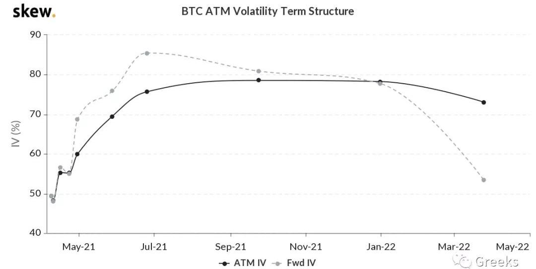 播報數據由Greeks.live和Skew.com提供。以太坊強勢反彈,重回2000美元,維持在前高上方,期權持倉量創出歷史新高。比特幣受帶動反彈回到58000附近的橫盤位置,成交量和持倉量也在溫和上升。BTC歷史波動率10d48%30d62%90d88%1Y68%DVol75.22%期權成交量10億美元,期權持倉量為110億美元。DVol小幅下降,日內首次跌至73%。DVol昨天冼老師有一堂公開課,感興趣的朋友可以關注一下。各標準化期限隱含波動率:今日:1m64%,3m76%,6m78%4/8:1m70%,3m78%,6m79%比特幣反彈至58000美元區間,Dvol一度下跌至73%,因為市場平靜,自Dvol推出以來不斷下降。市場平靜導致IV繼續下降,目前超短期已經下降至60%以下,當月也跌破65%。