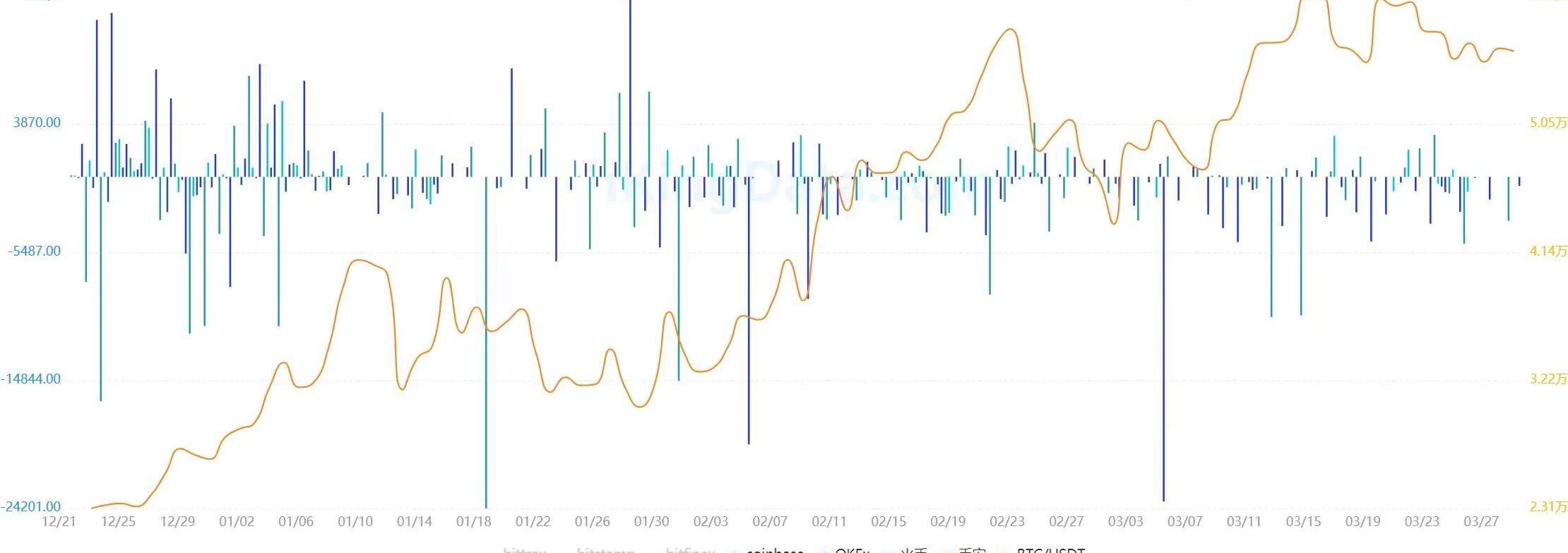 Coinbase交易所BTC流入數據圖表圖中ABCDE,Coinbase都出現大額流入BTC現象。其中BC放量流入后,BTC價格呈現現階段性上漲,D放量流出后,BTC價格出現短時下跌。A是一個持續性放量流入區域,BTC價格在此期間持續上漲。