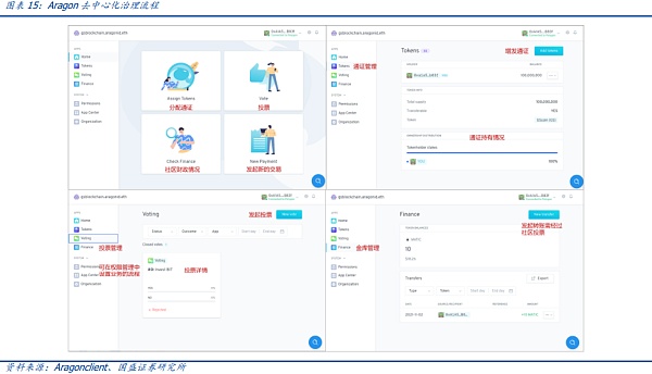 以Aragon為例,Aragon打造了一個DAO的框架,用戶可在此基礎上創建全球性的組織和社區。Aragon?是一個建立在以太坊上的去中心化治理平臺,它為公司和組織提供了一種模塊化的方式來創建和管理DAO。以其核心應用Aragonclient為例,其應用層主要分為權限設置(規范誰可以執行某項操作,劃分權限)、通證管理(發行和管理DAO通證)、投票功能和金庫管理(管理公司在Aragon?上面創建DAO?組織的資金),四個系統一起工作就可以運營一個基本的DAO。同時,Aragon client可以根據需求自定義軟件,通過改造Aragon client來適用于其他應用。