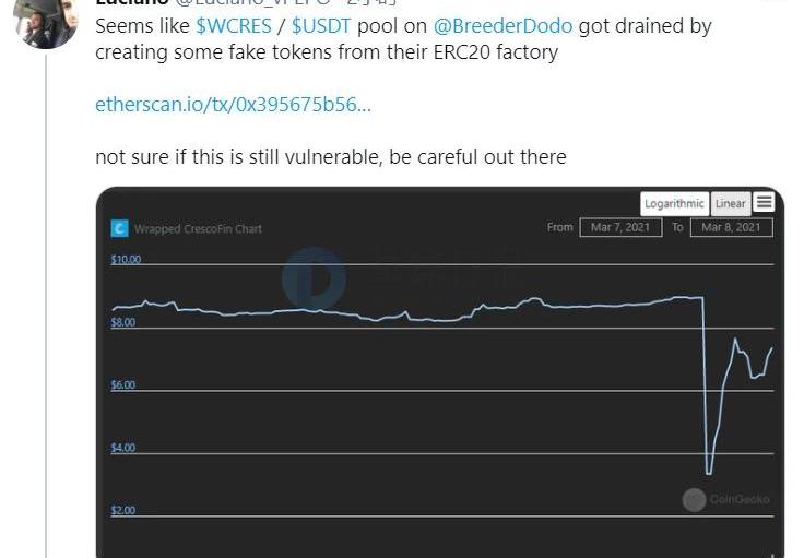 北京時間2021年3月9日,根據輿情監測顯示,去中心化交易所DODO上的wCRES/USDT資金池似乎被黑客攻擊,轉移走價值近98萬美元的WrappedCRES和近114萬美元的USDT。據DODO官方回復目前團隊正在進行調查。原地址如下:https://www.odaily.com/newsflashes/235047.html