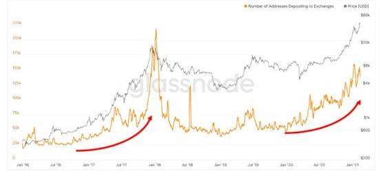 一旦價格上漲到一定水平,新老參與者便開始增加交易所的存幣數量,以獲取利潤或推測價格發現。將我們當前的周期與2017年的最后一次牛市進行比較,很明顯,我們仍處于曲線的早期加速階段。請注意,將存放地址的數量標準化為網絡中總地址的數量非常重要,自2017年以來,該總數增加了3倍。因此,應將下表中的當前地址數量除以3,以便與上一次牛市進行有效的比較。直到存入交易所的地址數量成指數增長,我們才算是最后。