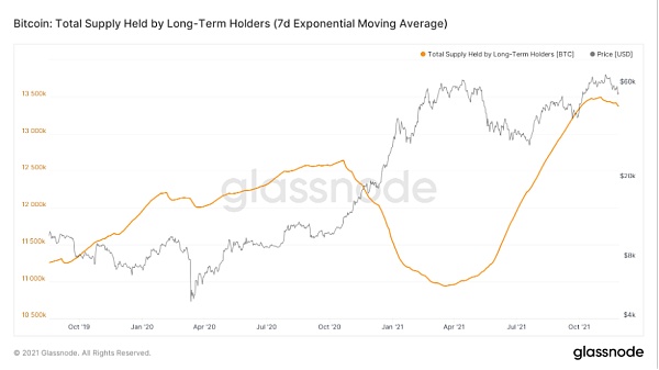 在 4 月份的比特幣高點附近,長期持有者持幣量基本已經觸底;然后在接下來的 5 個月內,伴隨著 519 的血洗以及隨后的陰跌,長期持有者持幣量迅速收復前高,并且在隨后的價格上漲中,持有量持續上漲。