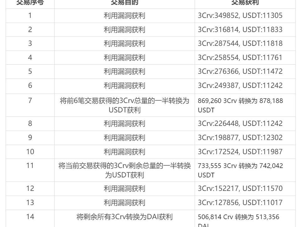攻擊者獲利數目截圖此次攻擊總計包括11筆利用漏洞獲利交易以及3筆轉換代幣交易,交易列表如下: