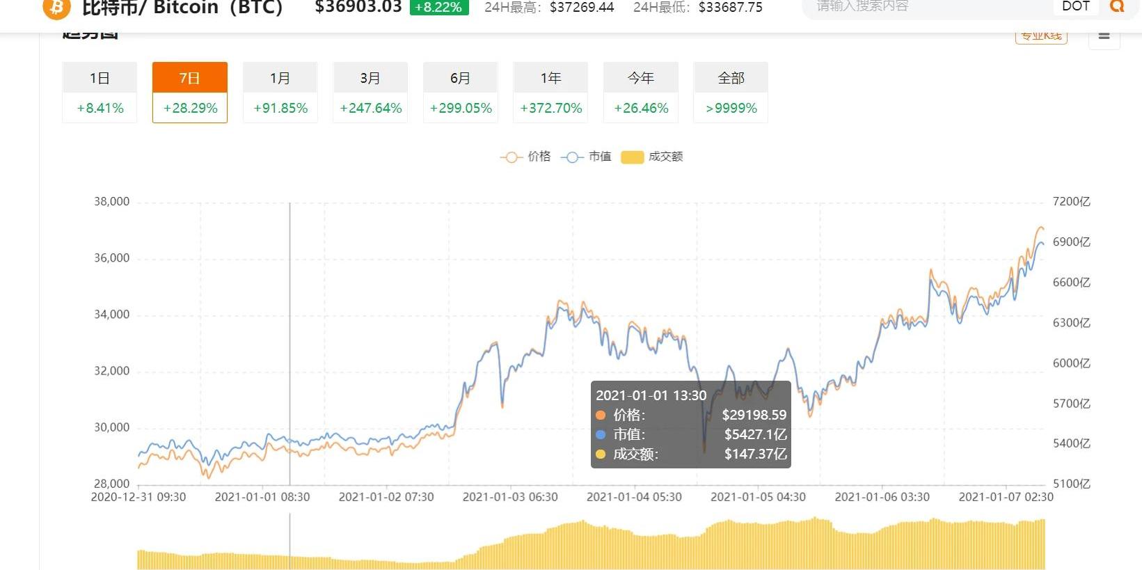 2021年開年,比特幣“瘋漲”首次突破3萬美元大關,迎來開門紅。根據CoinMarketCap的統計,1月3日比特幣盤中一度觸及34481.64美元,再度刷新最高幣價記錄.