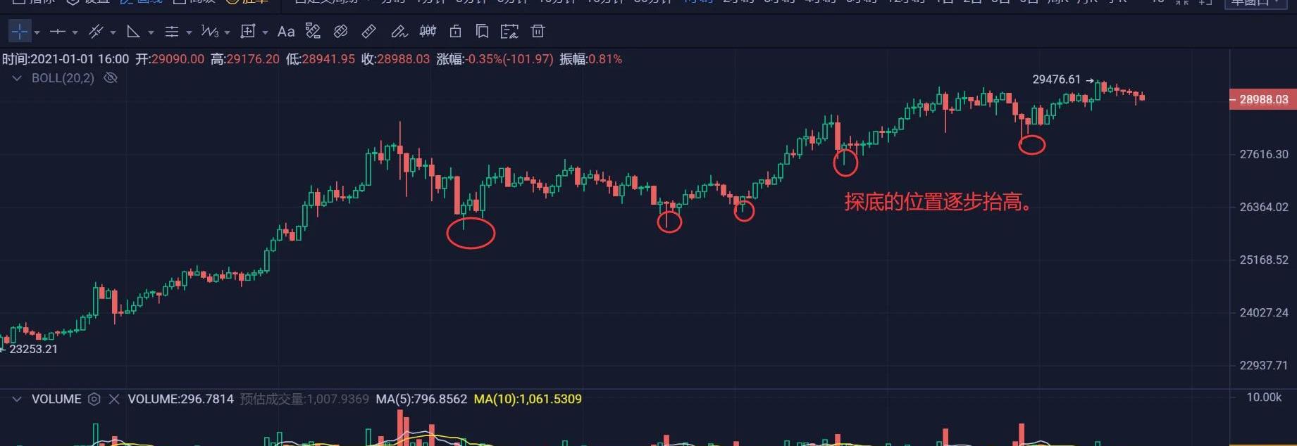 一部分原因是購買比特幣的成本太高,另一部分原因則是從投資的心態轉換成了投機的心態,寄望于便宜的幣種能一飛沖天,在這部分投資者心中,比特幣的漲幅終究有限,但想不到最后是比特幣漲幅最多,相當于最值得用投資心態參與的時候反而放棄了,當然這也不怪他們,沒有人能在遭受巨大損失后還能平等的看待“施害者”。在“312”之后,“世界銀行”美聯儲開始大肆放水、印鈔機開足了馬力,主要資金在流入股市和黃金市場的同時,也有部分資金流進比特幣市場,由于比特幣市場整體市值較小,還有相當一部分地址久久未動的幣,因此小部分資金就足以令比特幣上漲。一直漲到了比特幣減半的時期,即五月上旬,或許是利好已經提早兌現,面對產量減半的比特幣市場并未有什么反應,雖然期間一度突破過一萬,但到了七月份,整個市場只有極小的波動,而且回到了9000美元附近,此時的比特幣依然不被市場看好。到了7月底的時候,終于迎來轉機,DeFi爆發,DeFi的爆發確實在一定程度上能影響比特幣,畢竟DeFi上還是需要BTC來質押挖礦,變相的提高了比特幣的需求,但我認為,DeFi爆發最大的作用是為整個幣圈帶來了活力,也讓部分投資者重新回到幣圈。當DeFi活躍了一個月時間后便逐步沉寂,雖然說不是完全沒有聲音,但熱度的確在減退,而比特幣也開始陷入了低迷,整個9月份,比特幣以極其平緩的幅度上升,接下來,就迎接來“漲漲漲”的第四季度,而今年第四季度比特幣的漲幅也達到了整年的三分之二。第四季度的開局并不順利,十月初在國內是國慶假期,在國慶假期期間,美國一直倡導保股市、保經濟、支持放水的總統川普宣稱得了新冠,而后世界頭部交易所之一的bitmex高管被美國司法部門抓捕,緊跟而來的是國內三大交易所之一的okex突然暫緩提幣,放在以往,其中的任何一件事都稱的上是“黑天鵝”事件。然而,比特幣只在十月初調整了兩天便開始一路上行,上行的原因便是越來越多的機構和公司開始注意到比特幣乃至直接進場,進場后開始為比特幣搖旗吶喊,在促進幣價上漲的同時,也使得一些主流媒體包括央視財經頻道開始報道比特幣,從而形成良性效應。機構和公司注意到比特幣市場的原因則是源于特朗普得了新冠和總統大選即將開始,美國經濟環境開始不確定從而映射到全世界,這些傳統金融機構急切的想為手中的資金找一個安全的著陸點,而整個上半年從最低價上漲超過兩倍的比特幣無疑成了最好的選擇。即使進入了新的一個年份,比特幣的故事也并未結束,甚至可以稱得上才剛剛開始,當前看似有很多機構進入到了比特幣市場,但只是因為我們注意到才顯得數量比較多,實際上在傳統金融機構中依然只有很少的一部分,而且比特幣作為金融資產的潛力尚未被完全發掘,2021年無疑是很值得期待的一個年份。回到行情上,這兩天的行情走勢是比較矛盾的,整個市場都在期待著比特幣能在2020年完成達到30000美元的壯舉,但偏偏頻繁砸盤,而當市場認為行情會在年前來一波深入回調時,比特幣價格又向我們展現了韌性,每次砸盤后偏偏又能拉起來,還能刷新高,充分的體現了行情的糾結之處。近兩天看似30000美元是市場最關注的點位,但通過我們對行情的分析便知道,29000美元是近兩天行情的核心點,頻繁站上又頻繁跌破,上上下下始終難以確定。以今天行情為例,開盤后便直接沖高刷新了新高,在即將觸碰到29500美元時又表演了沖高回落,值得欣慰的是,每次探底的位置是越來越高的。