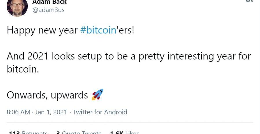 新年第一天,BlockstreamCEOAdamBack發推特稱,對于比特幣支持者來說,2021年看起來是非常有趣的一年。勇往直前,天天向上。
