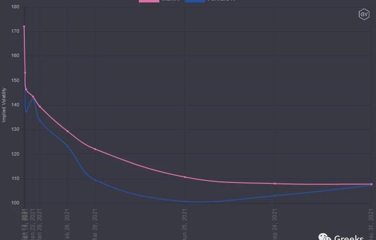 BTC歷史波動率10d99%30d82%90d68%1Y82%期權成交量15億美元,連續兩天都有十分驚人的成交量,目前持倉量為75億美元,持倉量維持不變,幣價下跌造成了美元計價的下降。各標準化期限隱含波動率:今日:1m134.4%,3m120.5%,6m109.4%1/12:1m137.8%,3m117.5%,6m109.1%比特幣連續的砸盤使得之前的FOMO情緒有所冷卻。但是巨大的波動水平使得現在的買方優勢極大,只關注Delta和Vega的盈利就已經可以覆蓋成本,如果配合Gamma端的盈利,即使頂著100+%的IV也可以做。