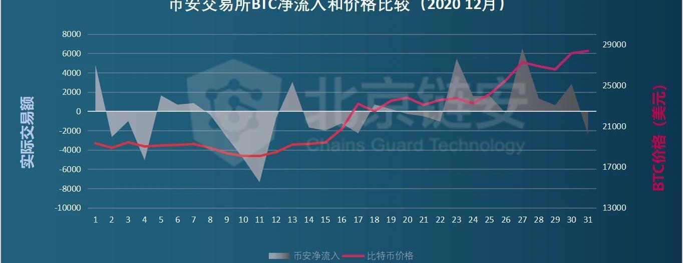 從2020年11月和12月兩個月的幣安凈流入與價格比較來看,我們可以發現,在近兩個月的比特幣價格大漲過程中,幣安交易所整體呈現出較為穩定的凈流入狀態,主要的凈流出時段還是發生在12月的上半月。